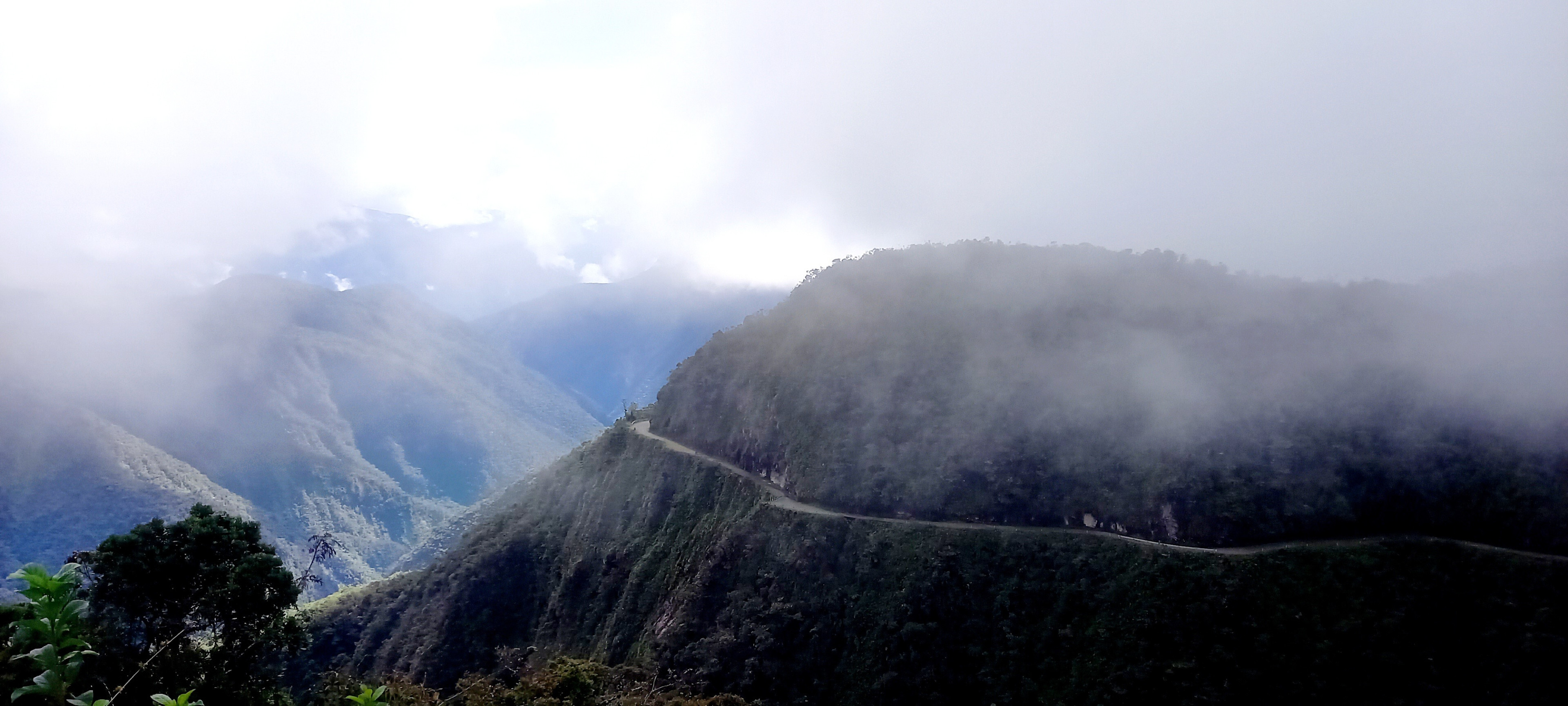 Diese Strasse führt durch alle Klimazonen die Südamerika zu bieten hat. Einmal wieder zeigt sich Bolivien als das Land der Superlative. Erstmal das Gewühl von La Paz nach einer gefühlten Stunde hinter sich gebracht, kanns ja nur noch besser werden. Im Nebel kommen wir an der Oberen Abzweigung und somit dem Einstig an, Die Sicht ist noch Nebelverhangen, doch siehe da, nach ein paar Minuten beginnt sich der Vorhang zu öffnen.