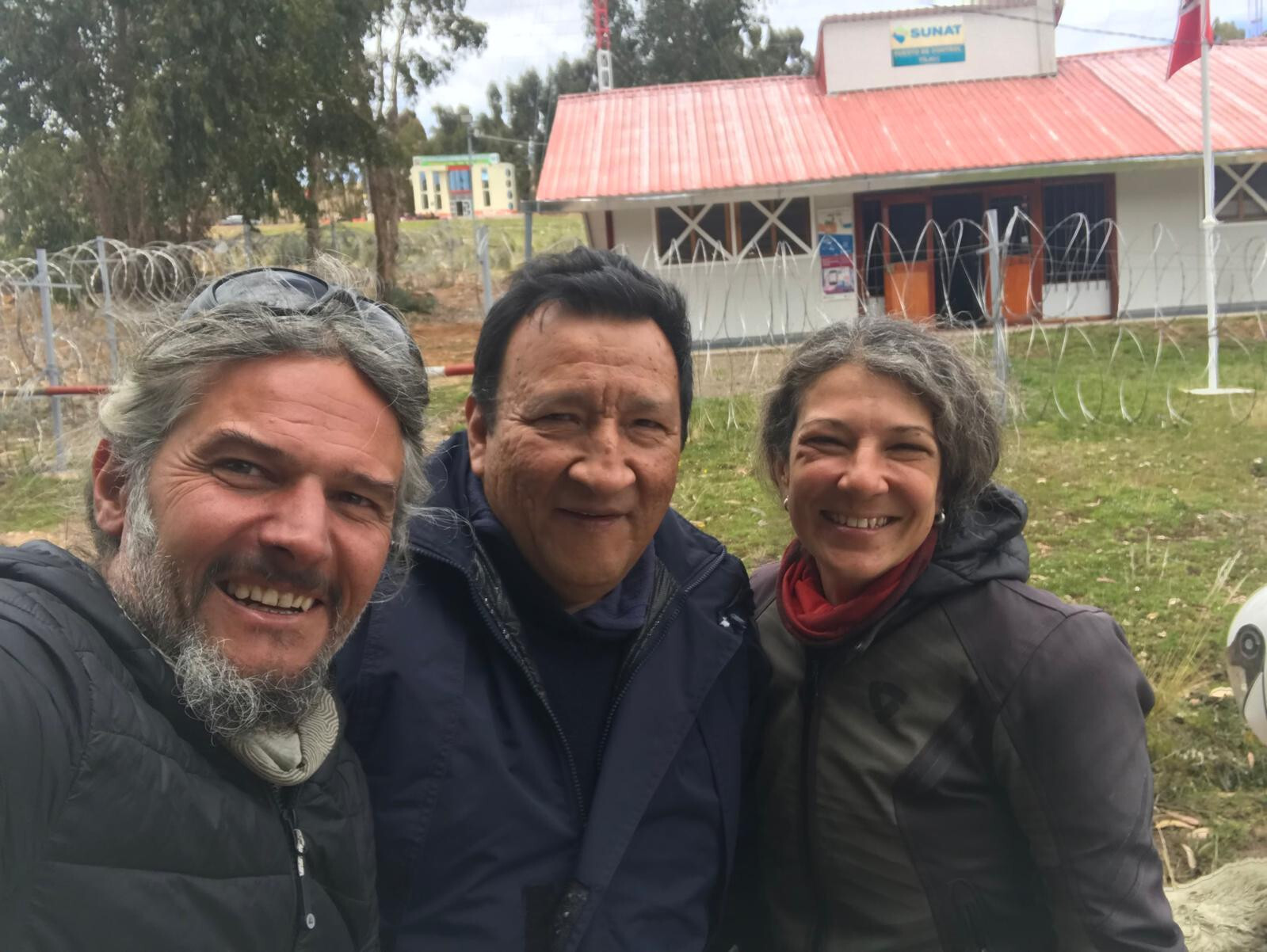 Niedlich wird zu ulkig. Die schwarz gekleideten Bolivianer freuen sich offensichtlich das mal jemand vorbeikommt und winken schon mal ihren in Kakifarbe gekleideten peruanischen Kollegen auf der anderen Seite zu das gleich Arbeit kommt. Mit den üblichen Fragen über Höchstgeschwindigkeit, PS, gefahrenen Kilometer und bereisten Ländern sind die Ausreise Arbeiten erledigt und die hölzerne Schranke geht auf. Die zwei Peruaner stehen schon bereit vor dem mit Stacheldraht umzäunten Zollhäuslein und begrüssen uns mit Spieglsonnenbrille und einem Lächeln.