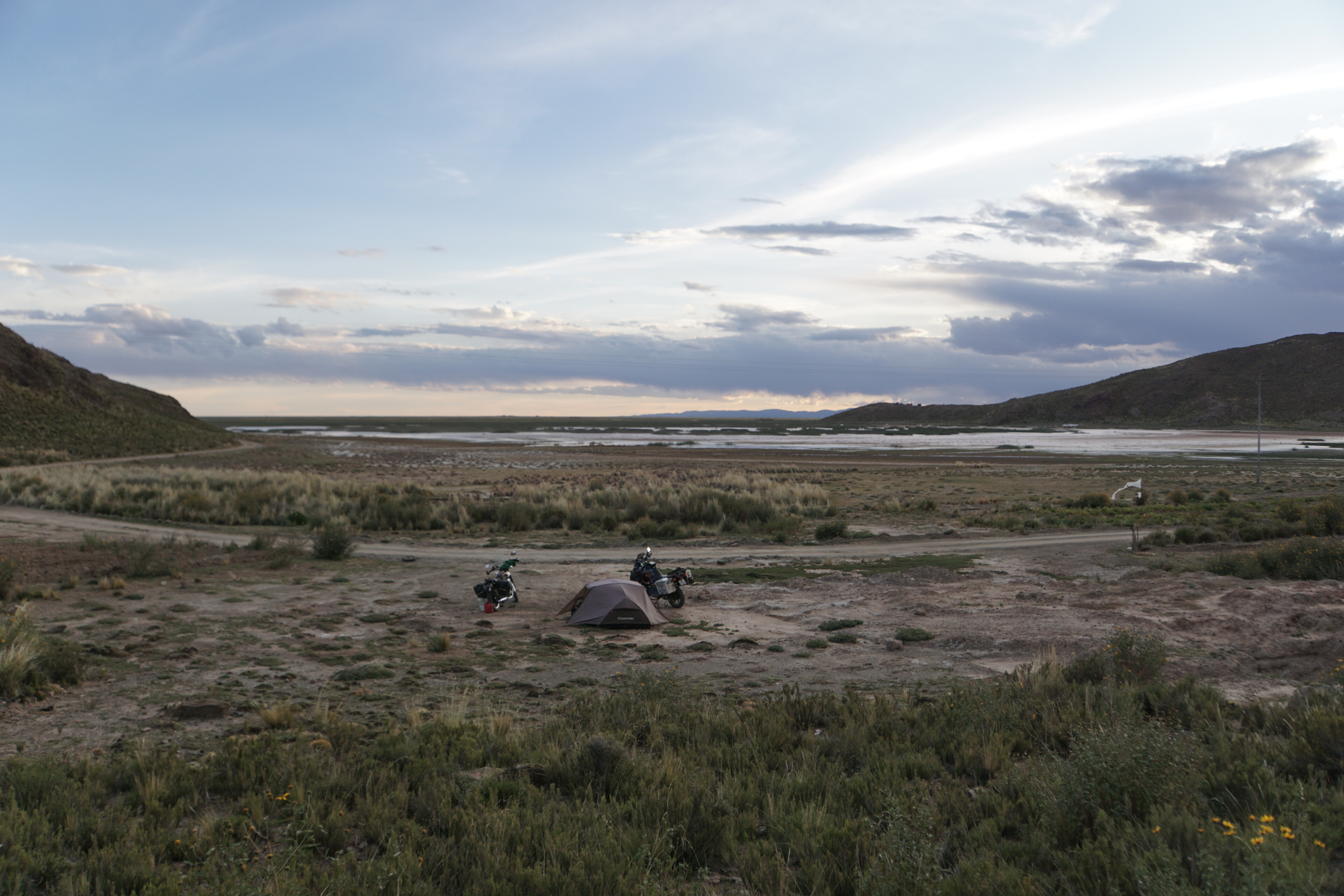 Nachdem wir eine kalte Nacht, mit feinem Abendessen, bestehend aus Alpaca Fleisch, Gemüse und Reis, kurz vor der bolivianischen Grenze in Colchane verbrachten, gehts nach dem Frühstück mit einer guten Ladung Coca Tee erstmal zur Grenze. Die Formalitäten sind relativ schnell erledigt und uns bleibt noch ein halber Tag für die Weiterreise. Auf dem Altiplano gehts weiter Richtung Oruro. Ganz schaffen wir es heute nicht mehr bis zur Grossstadt, was allerdings nichts ausmacht, da wir gerne noch mal einen Wildcampingspot ansteuern wollen. In Bolivien kann man fast überall frei stehen und unser Hotel der Millionen Sterne ist meist komfortabler als die angebotenen Unterkünfte. Den Platz den wir finden ist perfekt, mit Blick in die Weite der Prärie und einer wenig frequentierten Rumpelpiste. Kaum steht aber das Zelt, kommt schon ein kleines Moped vorbei, das auf einmal sehr langsam fährt und für die wir, anscheinend die Tagesattraktion sind. Wir winken, es winkt vom 3 Mann beladenen Motorrad zurück. Was wir erst gar nicht bemerken, ist ein Hund der dem Zweirad hinterher trottet.