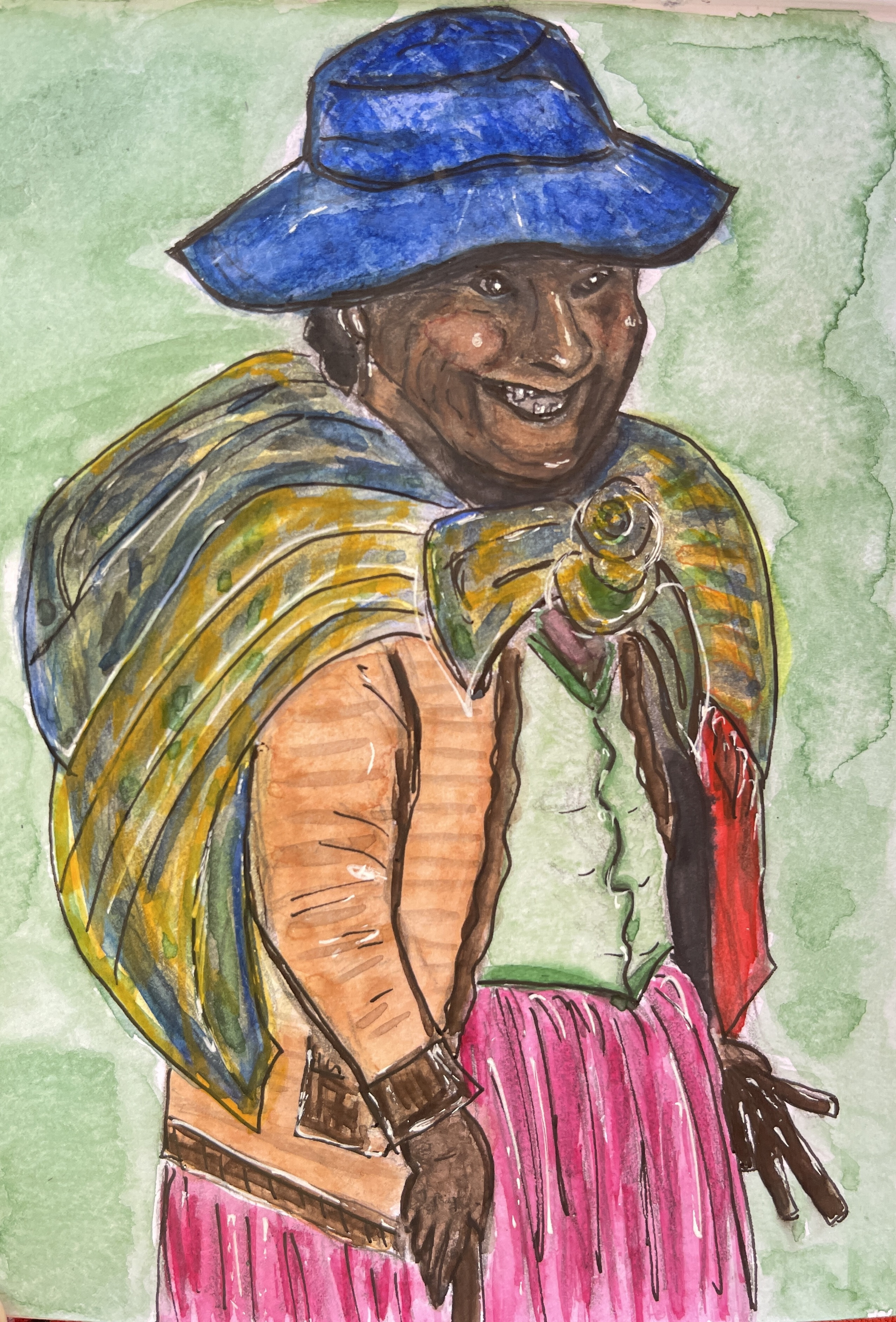 Eine kleine, ich meine sehr kleine Frau mit vielen bunten Röcken, einem Leinenbündel gefüllt mit Brennholz und einem noch kleineren schwarzem Hut, stand stampfend da, und ich war mir nicht sicher ob mit den Pilzen oder dem Coca Tee von gestern was nicht in Ordnung war. Ein kurzer Blick zu Simona ins Zelt und zurück, puff die Zwergenfee war weg.